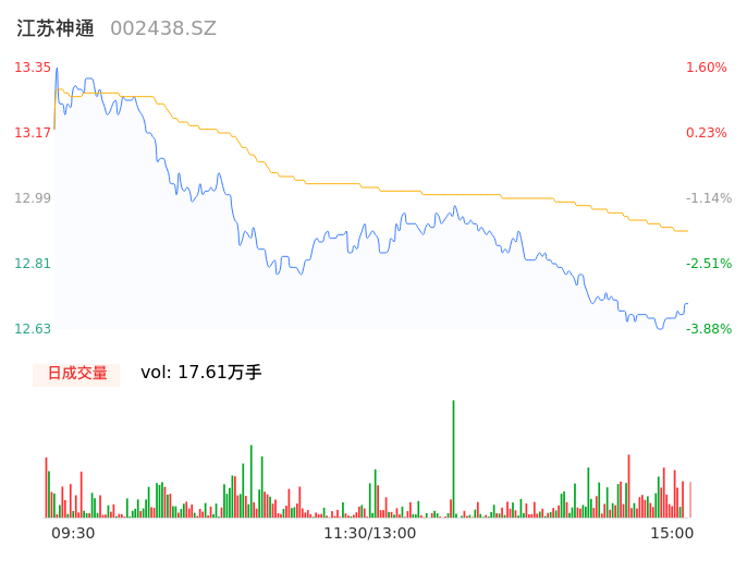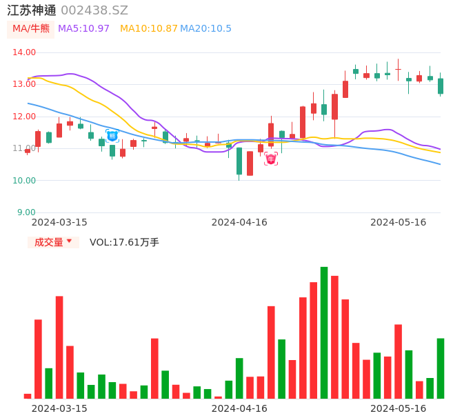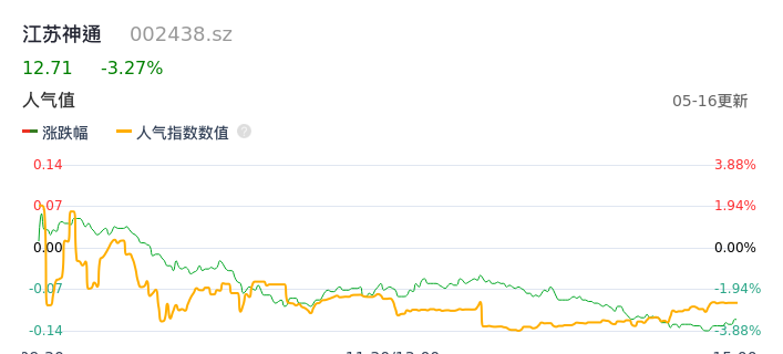 05月16日,江苏神通收报12.71,股价涨幅-3.27%,成交金额2.27亿元,换手率3.76%。
