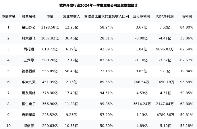 启明星辰最新报告期数据为一季度,下表汇总了软件开发行业内市值靠前的公司一季度主要经营数据