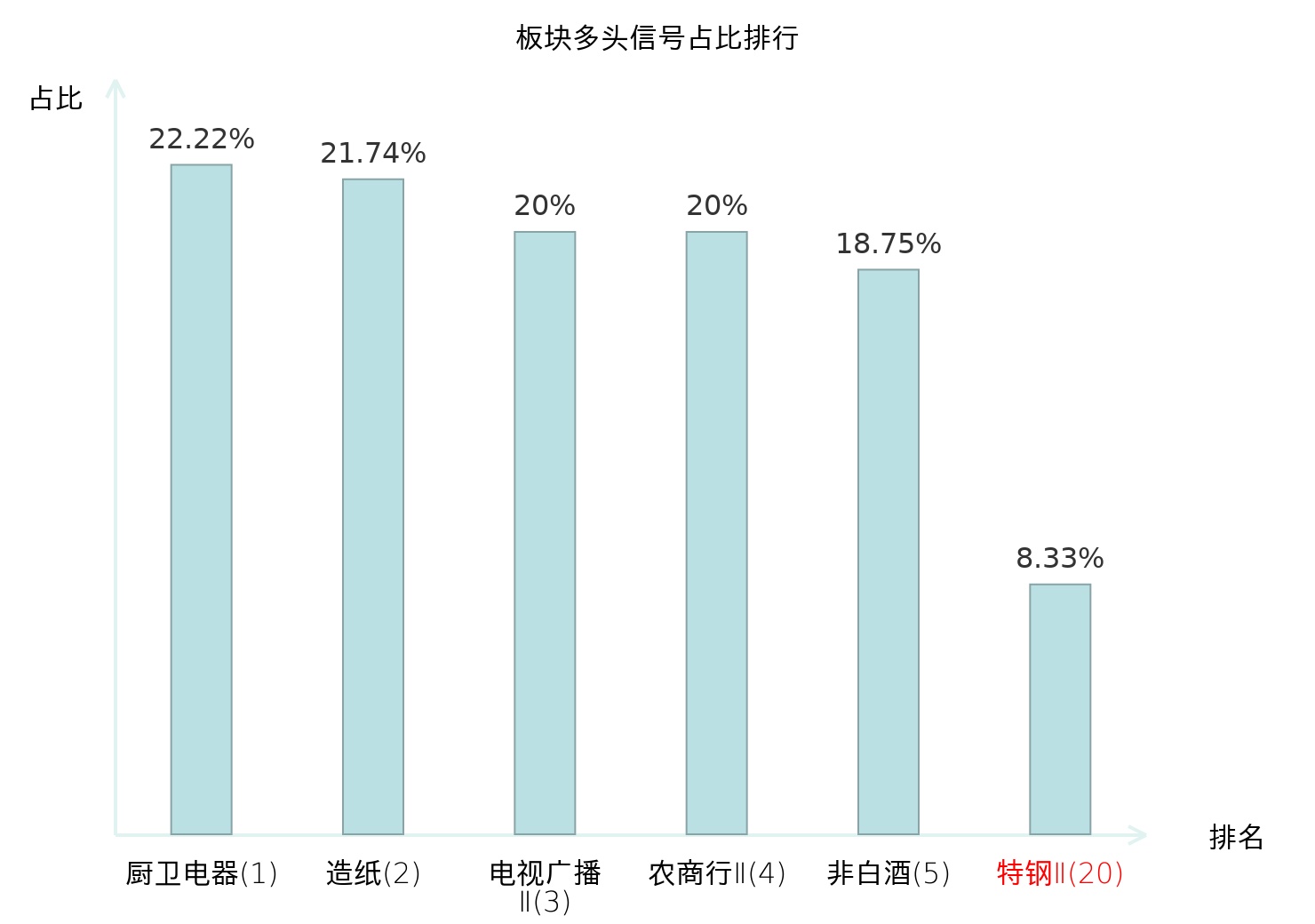 全市场所有行业板块中主力多头信号占比排名中,厨卫电器板块位居第一。厨卫电器板块名次提升最快,较昨日上升115位。