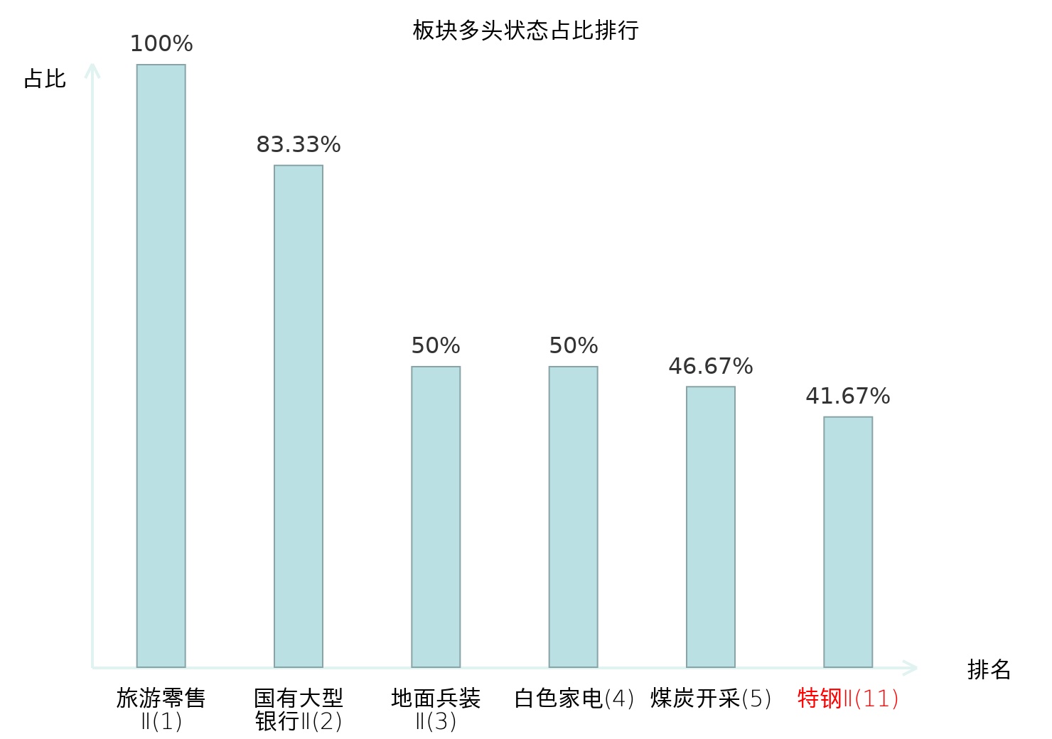 全市场所有行业板块中主力多头状态占比排名中,旅游零售Ⅱ板块位居第一。油服工程板块名次提升最快,较昨日上升107位。