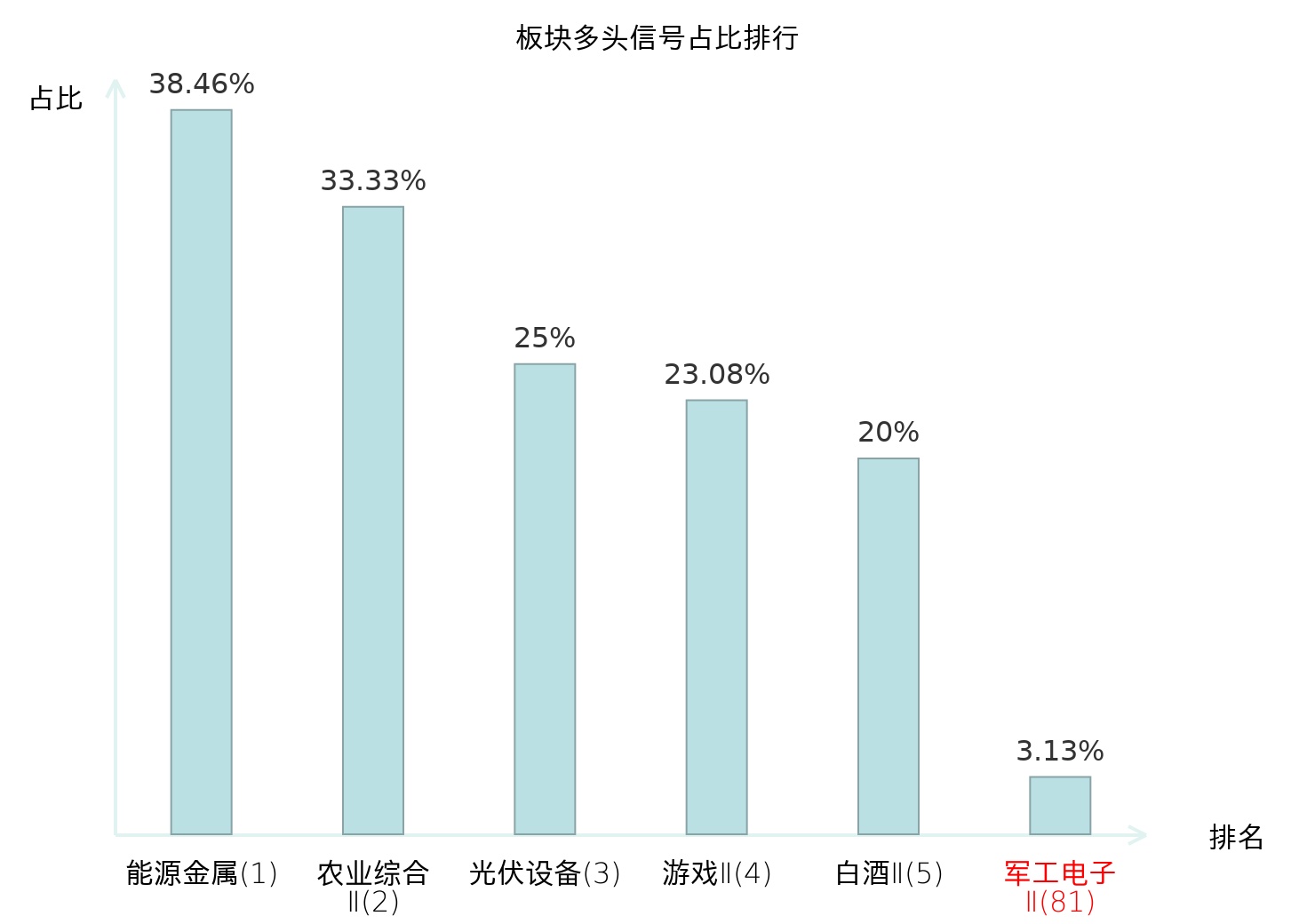 全市场所有行业板块中主力多头信号占比排名中,能源金属板块位居第一。农业综合Ⅱ板块名次提升最快,较昨日上升126位。