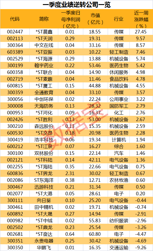 多家公司卯足了劲,通过并购重组、拉入有实力的股东入伙等运作力争公司业绩出现好转。从近一周的股价表现就能看出其中端倪,如*ST晨鑫收获5连板、* ST天润收获2个涨停板、*ST界龙收获1个涨停板。