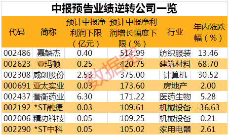 去年年报亏损的上市公司共有461家。市场对于亏损公司的业绩能否实现逆转比较关心。数据宝统计显示,去年业绩亏损的公司中,今年中报预计盈利的共有13家公司,其中嘉麟杰、亚玛顿和威创股份等8家公司预计净利润同比增长下限均在100%以上,除了*ST融捷外,其他7家公司年内股价均收涨,亚玛顿去年亏损0.97亿元,今年上半年净利润预计约为2500万元~3500万元,同比增长幅度在400%以上,公司股价亦有较好表现,年内涨幅近70%。