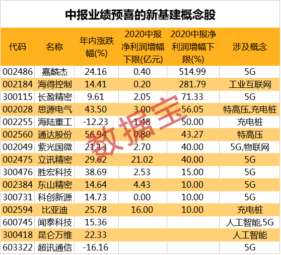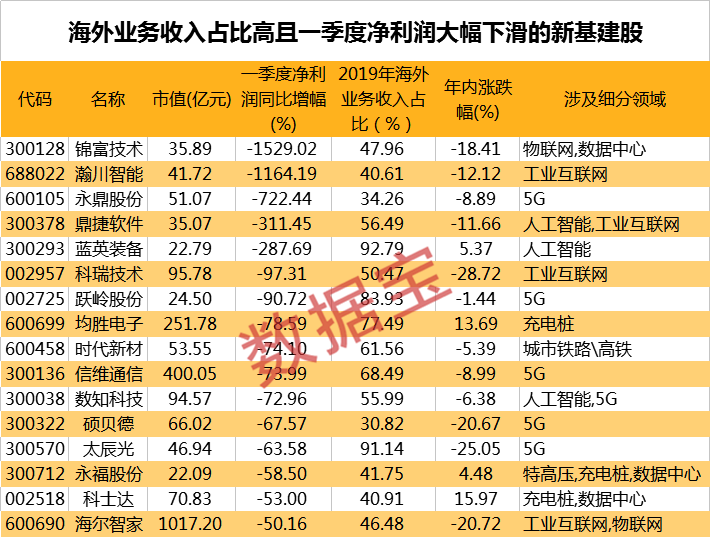 部分新基建公司一季度净利润大增,先进数通一季度净利润增幅接近15000%,晶方科技、闻泰科技、茂硕电源等6股一季度净利润同比增长1000%以上,这也是这些公司股价逆势大涨的重要原因。