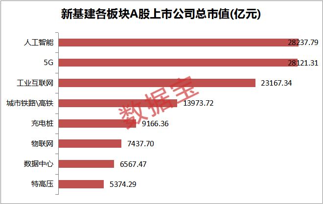 新基建已成为新一轮风口,根据战略规划,新基建包括5G基站建设、特高压、城际高速铁路和城市轨道交通、新能源汽车充电桩、大数据中心、人工智能、工业互联网等七大领域。据此,证券时报·数据宝对A股市场进行梳理,七大领域新基建共涉及606家上市公司,市值合计10.06万亿。其中人工智能板块及5G板块(含重复)市值均超过2.8万亿;特高压板块规模最小,为5374.29亿元;数据中心板块市值超过6500亿元。