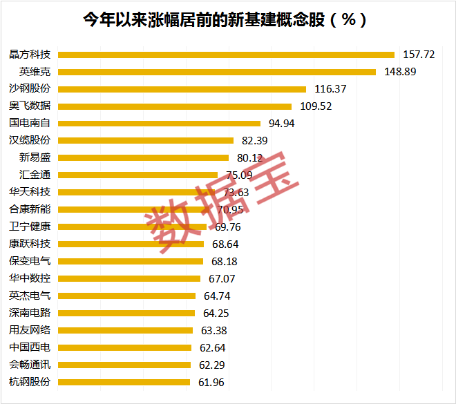对于投资者而言,最关心的还是新基建公司的市场表现、以及今年一季度业绩状况。今年以来,上述606股平均涨幅达到4.48%,大盘同期下跌6.23%,近六成个股跑赢大盘。36只个股今年以来股价涨幅超50%,4股在大跌行情下股价翻倍,包括晶方科技、英维克、沙钢股份及奥飞数据。5G、互联网概念股晶方科技今年以来股价涨近1.6倍,业绩表现十分抢眼。