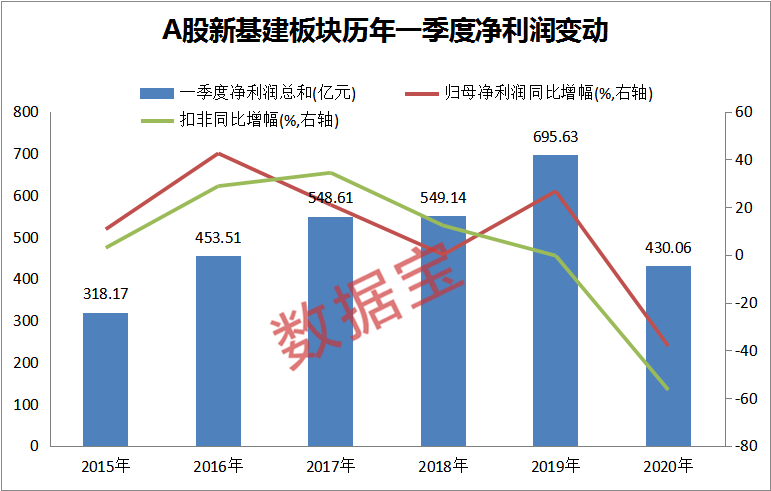 在新冠肺炎疫情的影响之下,各行各业可以说都迎来了“冰点时刻”,新基建板块也不例外。截至发稿,新基建板块一季度净利润合计430亿元,仍有4股尚未发布一季报(预告),创近5年同期新低,较2019年同期下滑38.17%。