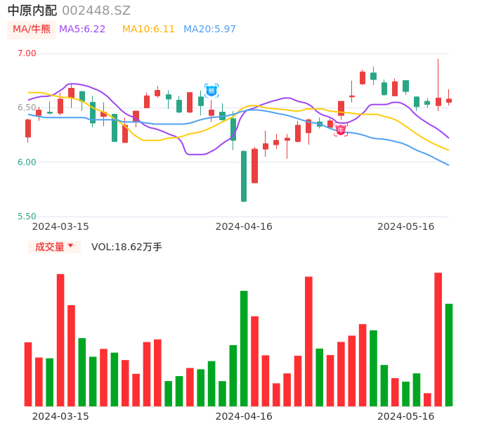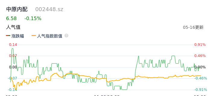 05月16日,中原内配收报6.58,股价涨幅-0.15%,成交金额1.23亿元,换手率3.82%。