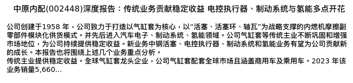 值得注意的是:2024年05月东兴证券的李金锦/吴征洋分析师,首次发布关于中原内配的研究报告,标题为:中原内配(002448)深度报告:传统业务贡献稳定收益 电控执行器、制动系统与氢能多点开花。
