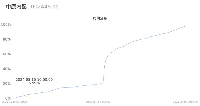 002448中原内配2024年05月15日成交22.45万手,成交金额1.50亿元,相较昨日放量14.83万手,换手率4.61%,成交清淡。