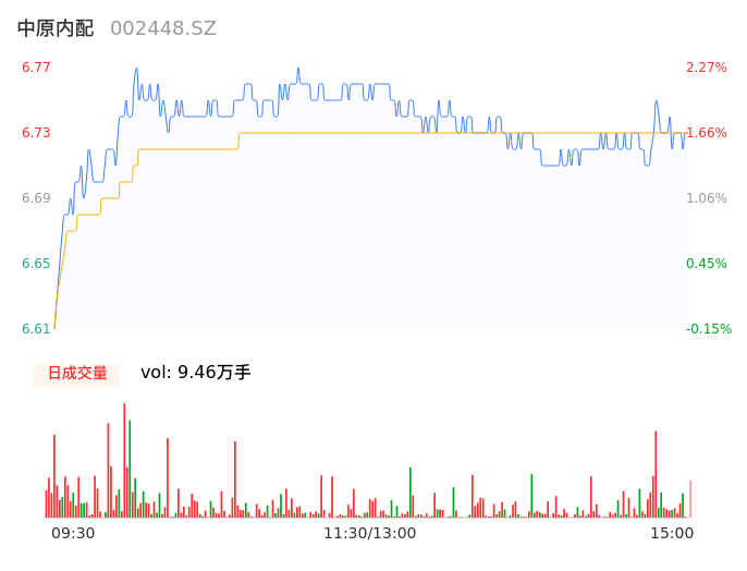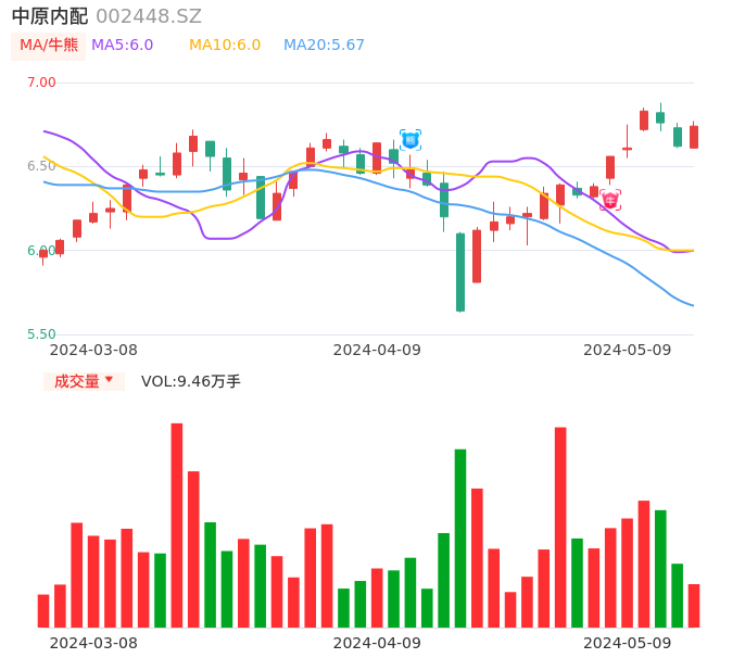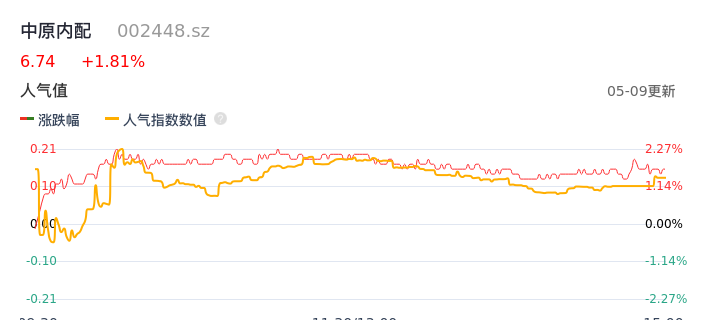 05月09日,中原内配收报6.74,股价涨幅1.81%,成交金额6368.53万元,换手率1.94%。