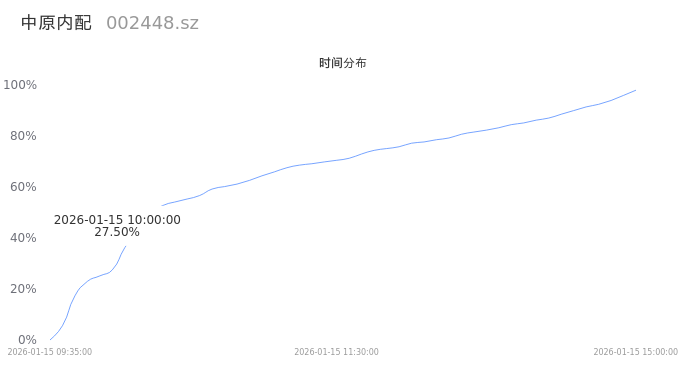 002448中原内配2026年01月15日成交21.50万手,成交金额2.80亿,相较昨日缩量6.32万手,换手率4.72%,成交清淡。