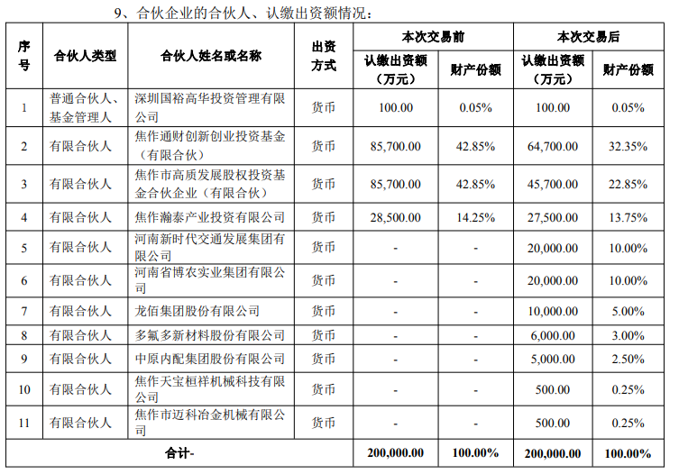 本次份额转让前,焦作通财持有河南空天产业基金8.57亿元认缴出资额,占比42.85%。本次转让中,焦作通财将合计10.5%未出资份额分别转让给龙佰集团(10000万元,占比5%)、多氟多(6000万元,占比3%)、中原内配(5000万元,占比2.5%),转让后焦作通财仍持有该基金6.47亿元认缴出资额,占比32.35%。除上述三家企业外,河南空天产业基金的合伙人还包括焦作市高质发展股权投资基金合伙企业(有限合伙)、焦作瀚泰产业投资有限公司、河南新时代交通发展集团有限公司、河南省博农实业集团有限公司等,各合伙人认缴出资额及占比均已明确。