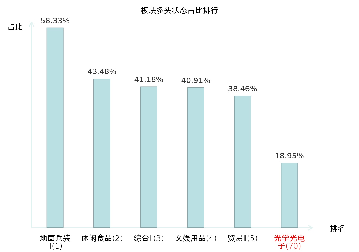 全市场所有行业板块中主力多头状态占比排名中,地面兵装Ⅱ板块位居第一。林业Ⅱ板块名次提升最快,较昨日上升90位。