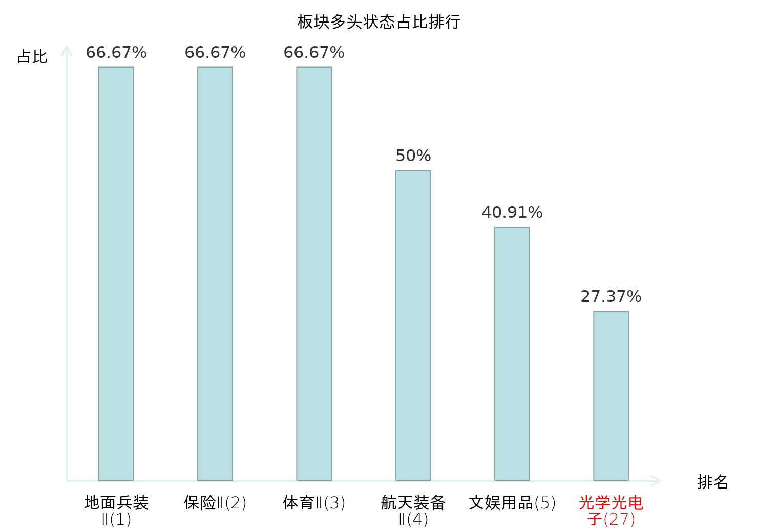 全市场所有行业板块中主力多头状态占比排名中,地面兵装Ⅱ板块位居第一。专业连锁Ⅱ板块名次提升最快,较昨日上升102位。