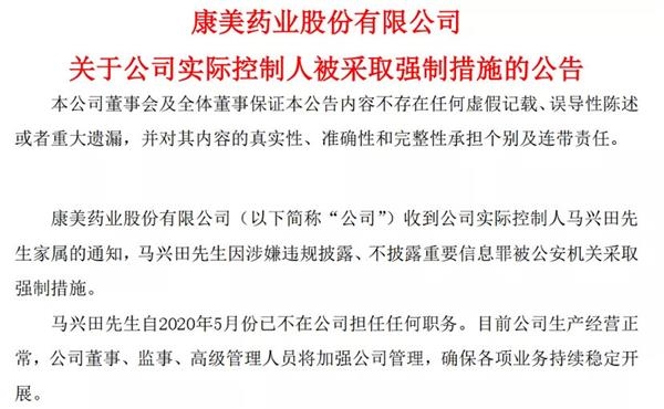 继近日*ST康得因财务造假收到证监会下发的行政处罚及市场禁入事先告知书后,7月9日,ST康美发布公告称,收到公司实际控制人马兴田家属的通知,马兴田因涉嫌违规披露、不披露重要信息罪被公安机关采取强制措施。