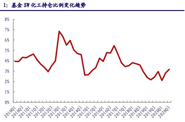 对公募基2010年1季度以来的重仓股数据进行了统计和分析。2020年3季度公募基金重仓持有化工股占全部 A 股比例为3.18%,环比提升0.34个百分点,但依然处在历史底部区域。今年以来,公募基金配置化工股意愿自底部开始逐季回升、加仓迹象明显,是对化工行业整体周期改善的充分反映。长远来看,我们认为化工行业仍存在周期改善预期,同时具有较高的安全边际,基金持仓比例有望持续。