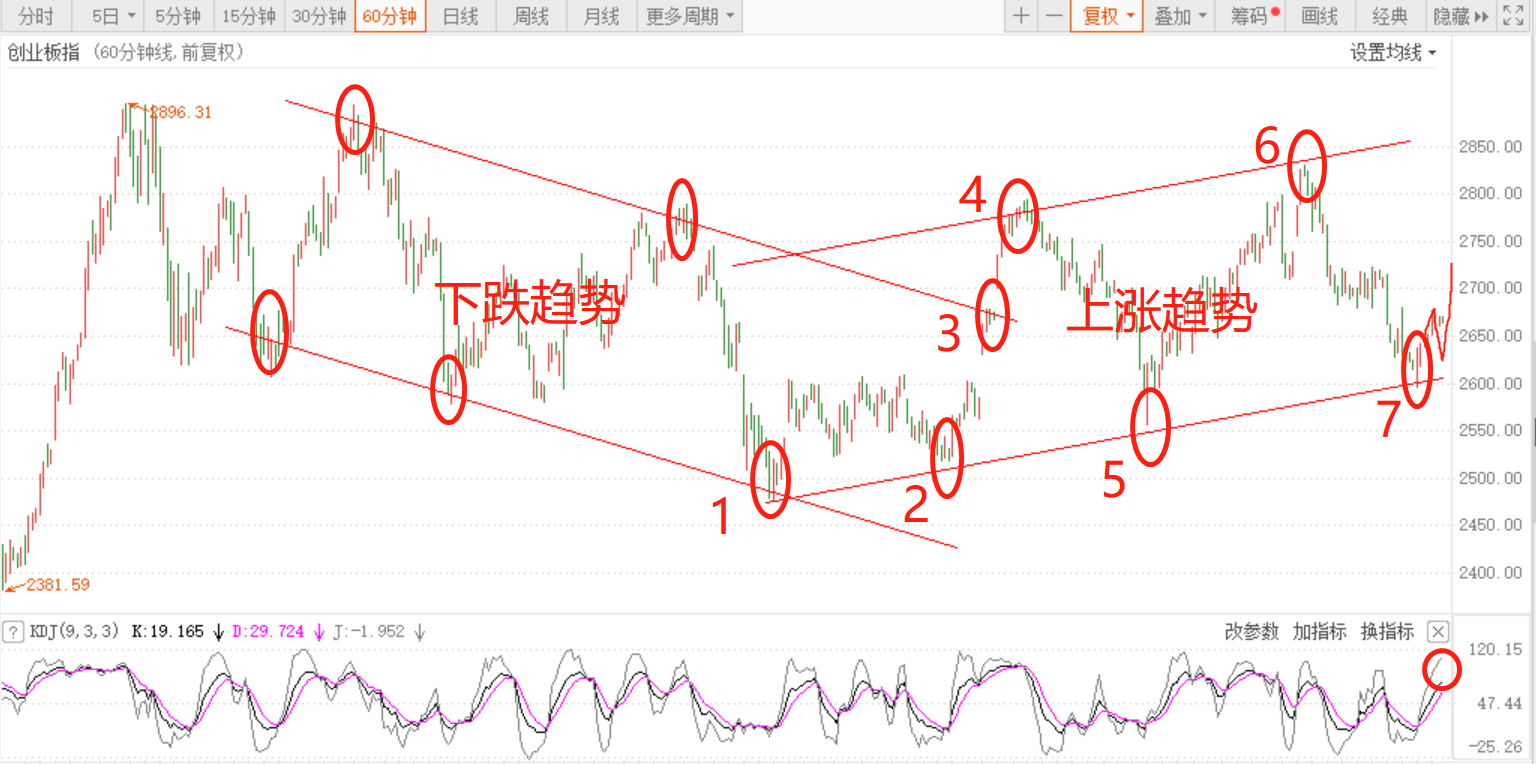 60分钟周期,创业板指突破3位置后下跌趋势结束,经过4位置,1、2、4三点确认趋势反转,新上升趋势开启,后来指数如期经过通道线5、6、7位置,到7位置也如期反弹,目前KD值都在50以上,说明行情处于多头市场,但目前K、D线有即将首次形成向下峰的迹象,所以短期有趋弱的可能,但从大周期日线级别看,K值20左右即将右侧金叉D线正是买入的时机,大级别决定大趋势,所以正常情况下,下周创业板指数走势也应该是震荡向上的。