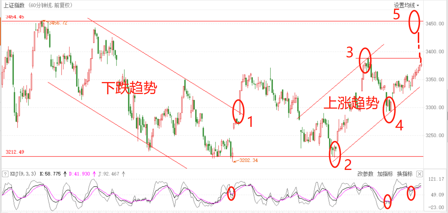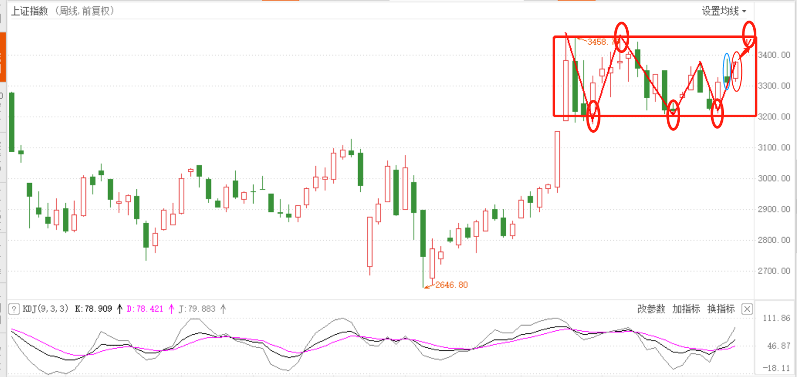技术上,60分钟周期,上证综指前期有效突破位置1,下跌趋势结束;回调至2处获有效支撑,2、3、4三点确定趋势反转,目前指数正处上升通道中,正常情况下指数突破3位置的水平压力位后,下一目标位应该是经过3位置的上升轨道线与经过5位置的水平压力线的双重交叉点,也即3456.72点;而目前KD值显示指数正处多头市场的较强势上行期(可以结合1、2那波行情KD位置观察);而且,结合周线图看上证综指正处箱体底部开始的这一波上涨中,且本周收阳的实体K线已经吞没上周阴线实体部分,综合来看,下周上涨综指后市有望走震荡上行模式。