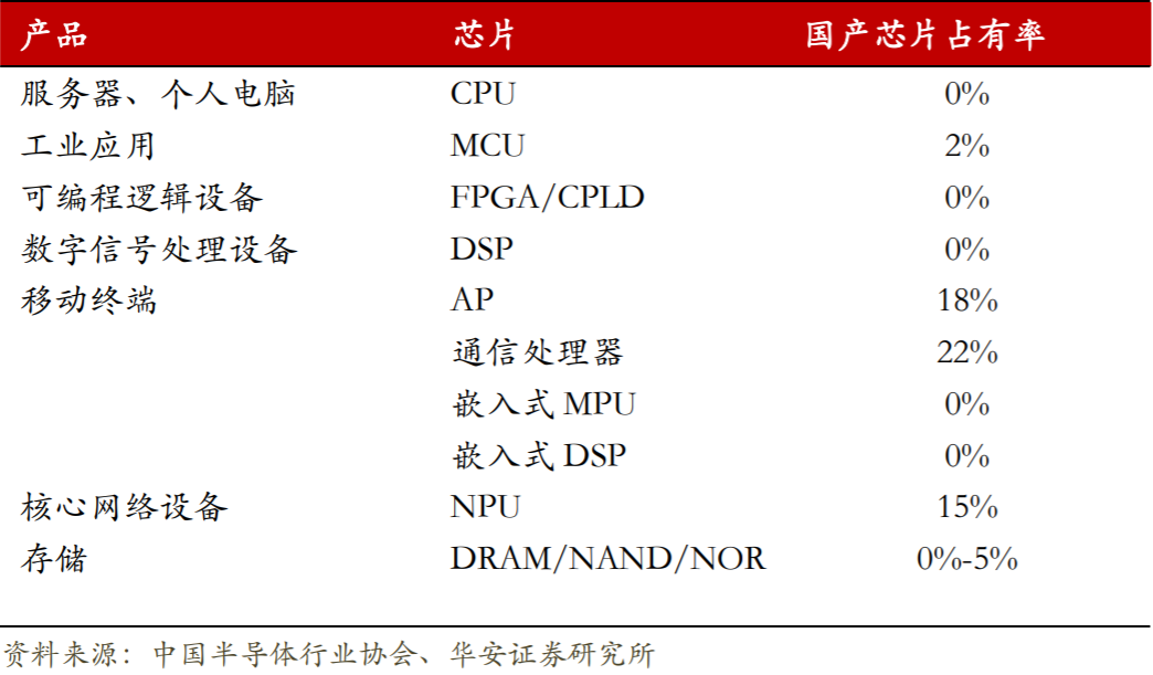 中国半导体行业协会数据显示,目前我国国产芯片在服务器和个人电脑的核心芯片 CPU 以及工业应用核心芯片 MCU 领域占有率分别为 0%和 2%;半导体存储器件中,除 NOR FLASH 芯片由兆易创新国产占 5%市场外,DRAM、NAND Flash 芯片也为零。移动通信领域,由于中兴华为本身也是设备厂,占据了对系统理解的优势,在基带处理器与应用处理器中,国产芯片占了 18%与 22%的市场;但在嵌入式 MPU、DSP、AP 领域,国产芯片市场占有率几乎为零。整体而言我国产品仍高度依赖于国外的芯片,亟需国产替代的空间非常广阔。