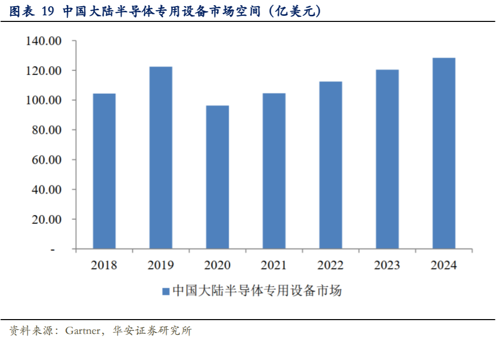 半导体专用设备市场与半导体产业景气状况紧密相关,中国大陆半导体专用设备市场规模快速发展,随着全球半导体产业链不断向中国大陆转移,将会支撑中国集成电路产业持续快速发展。相关统计数据显示,2018年中国大陆芯片制造厂商设备支出达104.34 亿美元,2019 年122.44 亿美元,2020年受全球半导体产业景气度传导的影响,预计将下降为 96.28 亿美元,随着2021年全球半导体行业逐渐复苏,预计2024年将增长至128.42 亿美元;2020年2024年预计年复合增长率为7.47%,将高于全球6.27%。