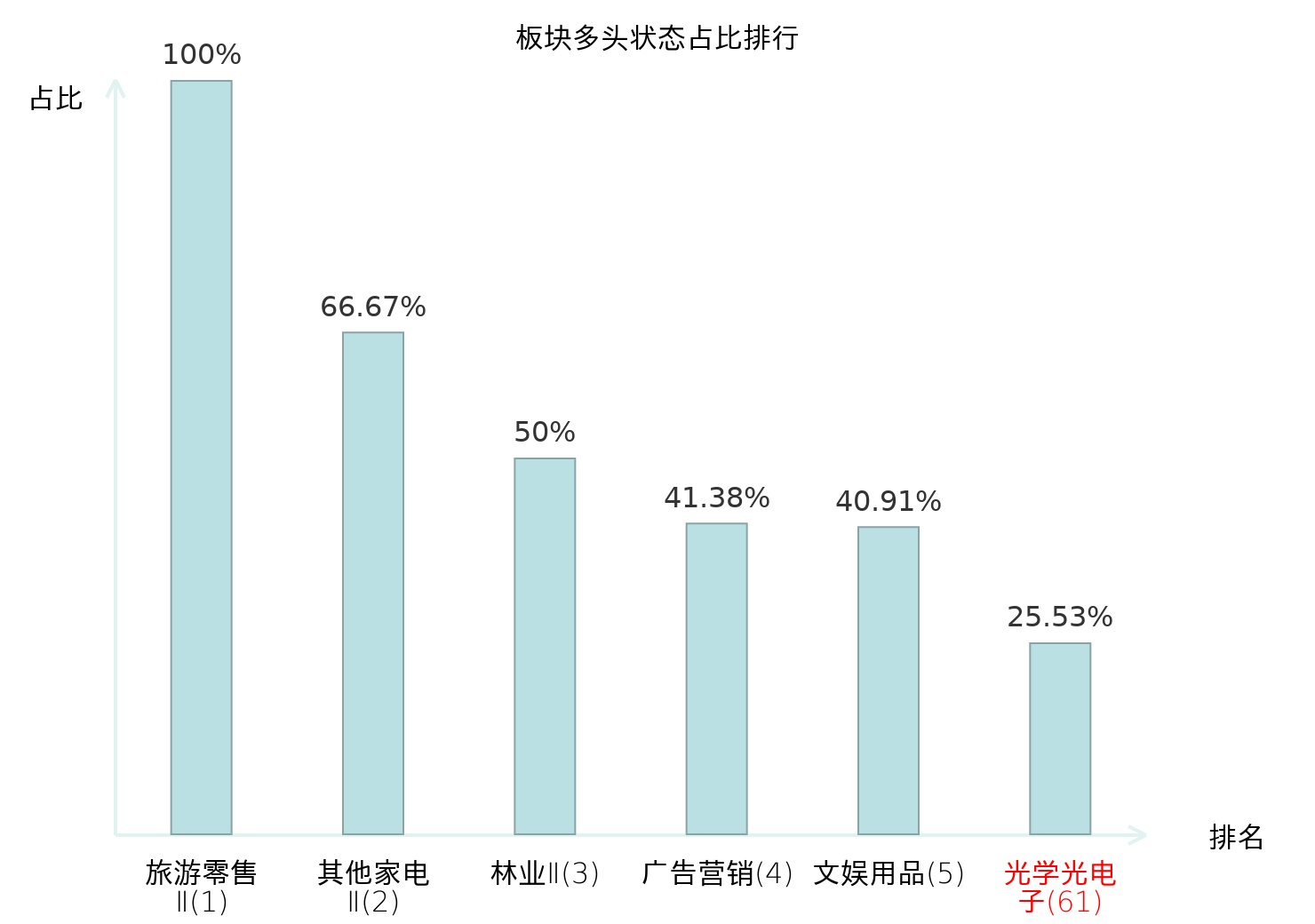 全市场所有行业板块中主力多头状态占比排名中,旅游零售Ⅱ板块位居第一。房屋建设Ⅱ板块名次提升最快,较昨日上升64位。