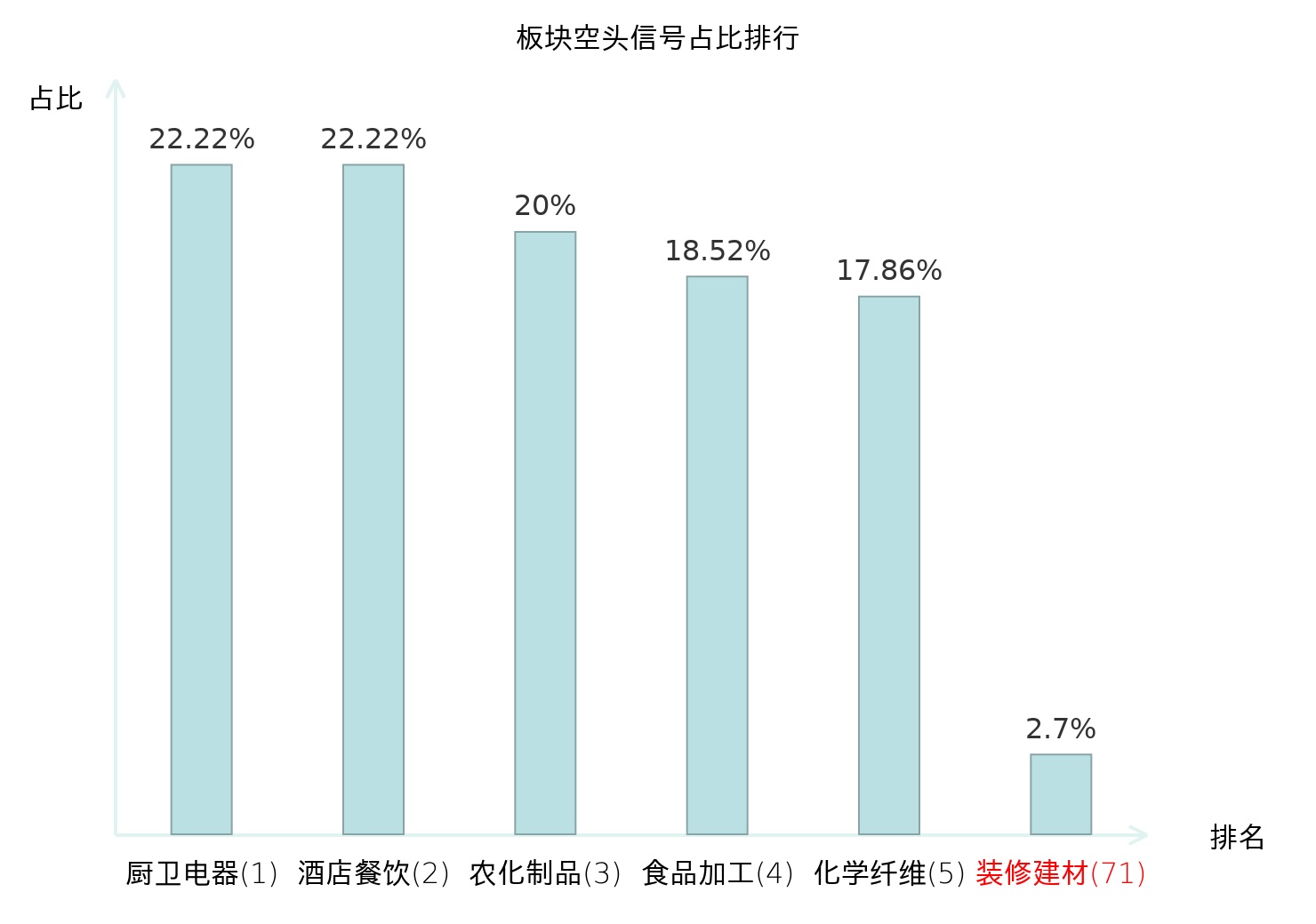 全市场所有行业板块中主力空头信号占比排名中,厨卫电器板块位居第一。化学纤维板块名次提升最快,较昨日上升119位。