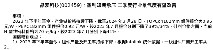 值得注意的是:2024年04月国信证券的王蔚祺/李恒源分析师,首次发布关于晶澳科技的研究报告,标题为:晶澳科技(002459):盈利短期承压 二季度行业景气度有望改善。