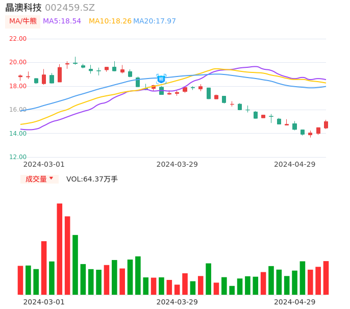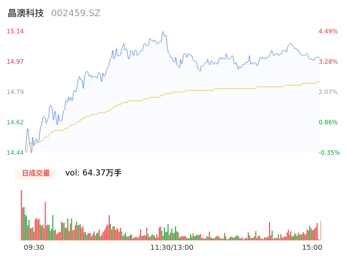 04月29日,晶澳科技收报15.00,股价涨幅3.52%,成交金额9.56亿元,换手率1.95%。