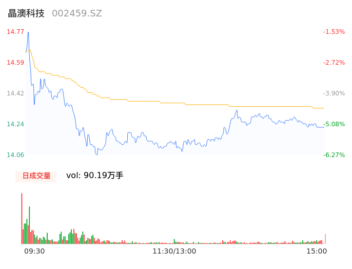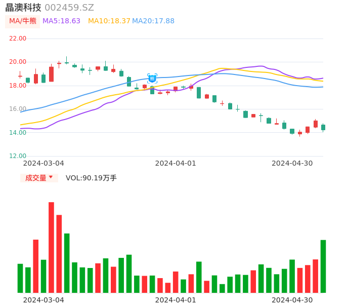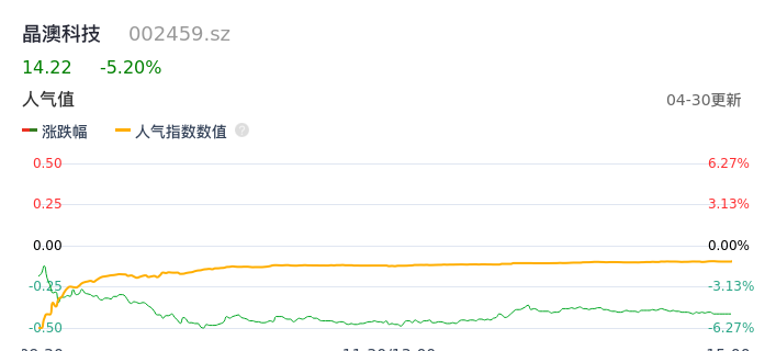 04月30日,晶澳科技收报14.22,股价涨幅-5.20%,成交金额12.92亿元,换手率2.73%。