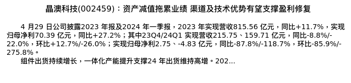值得注意的是:2024年04月国金证券的姚遥/张嘉文分析师,首次发布关于晶澳科技的研究报告,标题为:晶澳科技(002459):资产减值拖累业绩 渠道及技术优势有望支撑盈利修复。