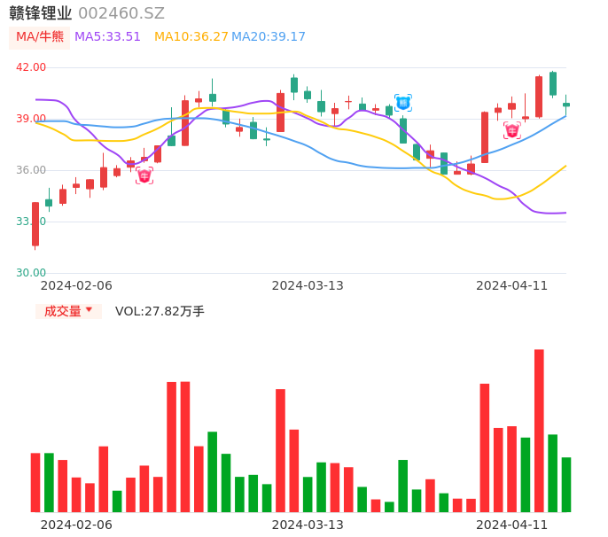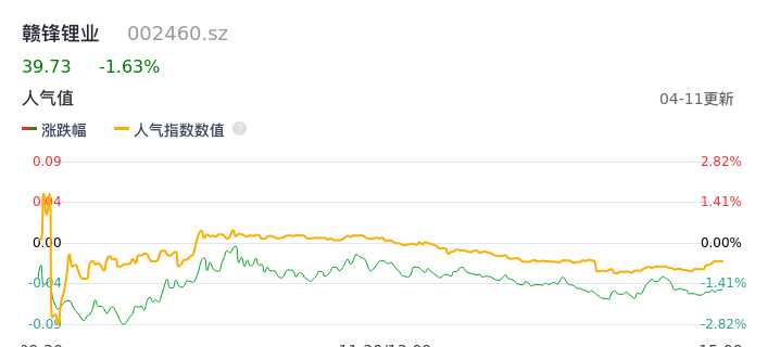 04月11日,赣锋锂业收报39.73,股价涨幅-1.63%,成交金额11.06亿元,换手率2.30%。