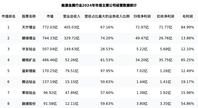 赣锋锂业最新报告期数据为年报,下表汇总了能源金属行业内市值靠前的公司年报主要经营数据