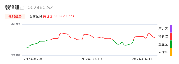 我们来看一下该股的九方特色指标强弱趋势的情况:赣锋锂业自04月01日从观望区上穿到持仓区。股价近期在多头区域回调整理。后续重点关注多空分界点的争夺:38.87元。如未能有效站稳则可能重新回到空头行情。
