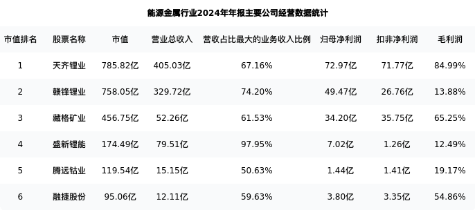赣锋锂业最新报告期数据为年报,下表汇总了能源金属行业内市值靠前的公司年报主要经营数据