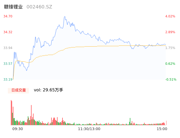 04月25日,赣锋锂业收报34.03,股价涨幅2.01%,成交金额10.08亿元,换手率2.45%。