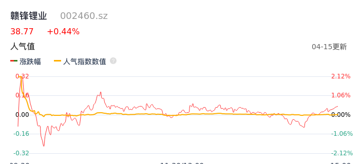 04月15日,赣锋锂业收报38.77,股价涨幅0.44%,成交金额9.61亿元,换手率2.06%。