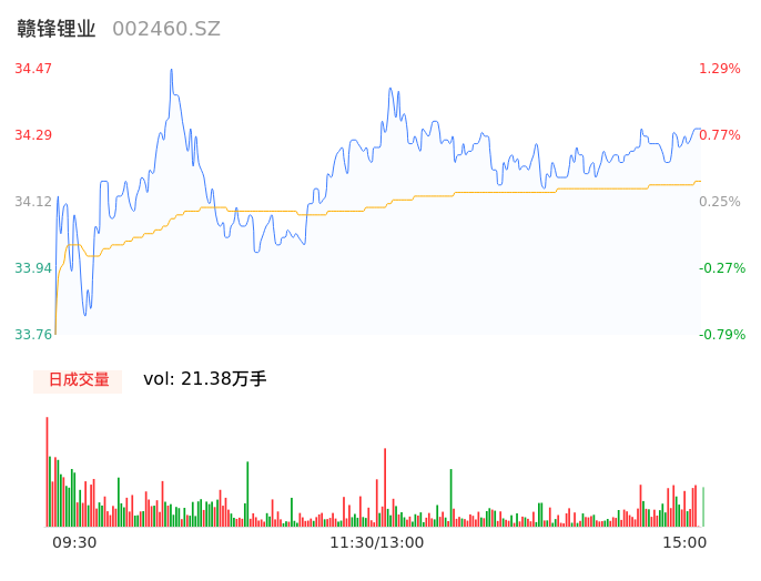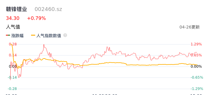 04月26日,赣锋锂业收报34.30,股价涨幅0.79%,成交金额7.31亿元,换手率1.77%。