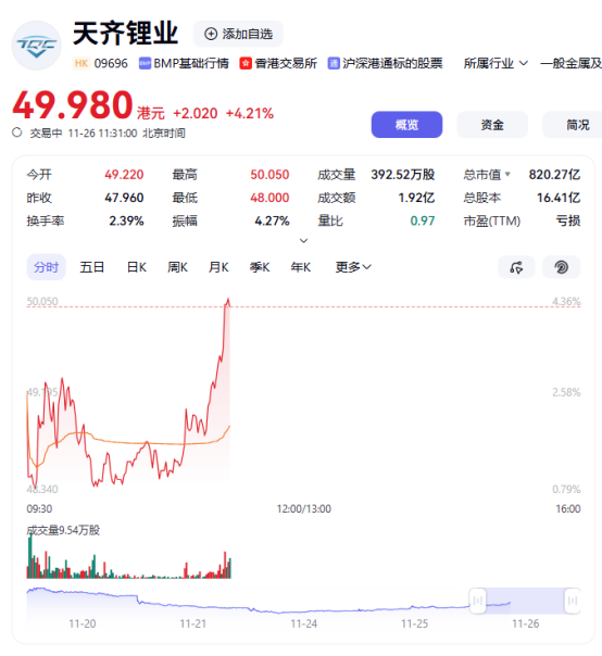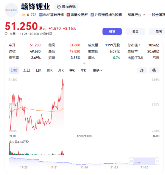 上证报中国证券网讯11月26日,港股锂业“双雄”赣锋锂业、天齐锂业H股双双走强,截至11:31,赣锋锂业、天齐锂业股价分别上涨3.16%、4.21%。