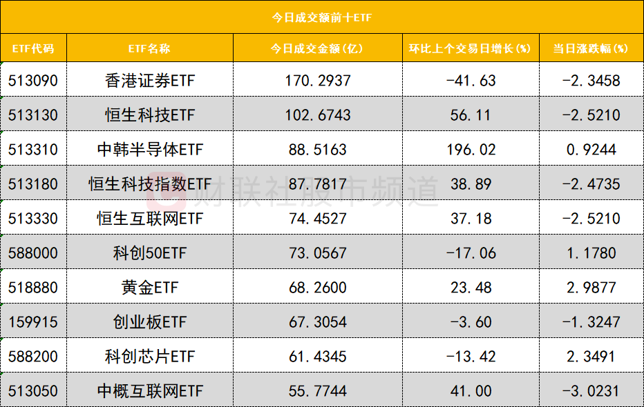 从成交额前十的ETF来看,香港证券ETF(513090)成交额位居首位,恒生科技ETF(513130)成交额位居次席。