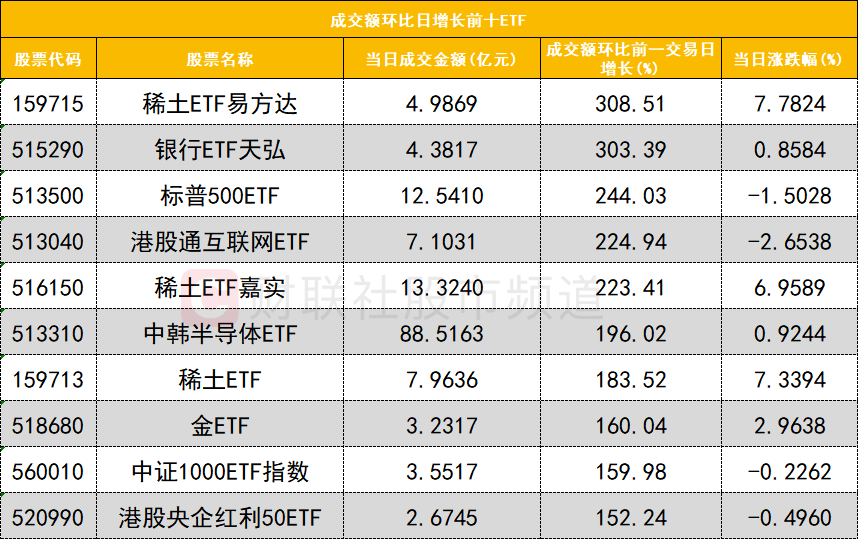 从成交额环比增长前十的ETF来看,稀土ETF易方达(159715)成交额环比增长308%位居首位;银行ETF天弘(515290)成交额环比增长303%位居次席。