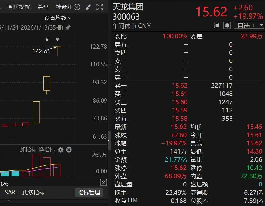 临近午盘,锂矿概念股集体异动,西藏珠峰(600338)大幅拉升涨停,赣锋锂业、盛新锂能、盐湖股份、天齐锂业、金圆股份、大中矿业等集体上涨。消息面上,1月13日早盘,广期所碳酸锂期货主力合约突破17万元/吨大关,盘中触及涨停,涨幅12%,报174060元/吨,为连续第二日涨停。