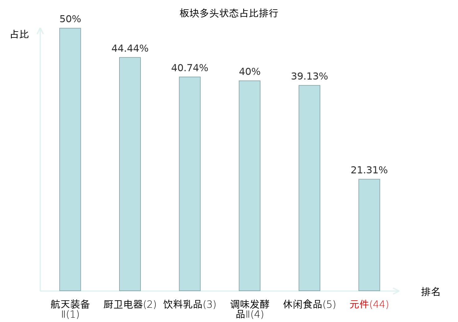 全市场所有行业板块中主力多头状态占比排名中,航天装备Ⅱ板块位居第一。林业Ⅱ板块名次提升最快,较昨日上升92位。
