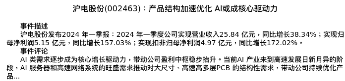值得注意的是:2024年05月长江证券的杨洋/范超分析师,首次发布关于沪电股份的研究报告,标题为:沪电股份(002463):产品结构加速优化 AI或成核心驱动力。