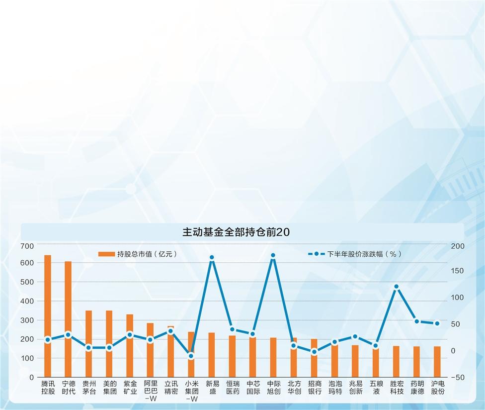 基金2025年半年报数据显示,主动基金全部持仓前20大股票出现明显切换,腾讯控股、阿里巴巴-W、新易盛、中芯国际H股、中际旭创、招商银行、泡泡玛特、兆易创新、胜宏科技等在今年上半年获得主动基金加仓,这些公司多属于新消费、人工智能等成长领域。