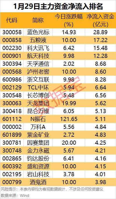 此外,还有科大讯飞、航天科技、天孚通信、泸州老窖和浙文互联主力资金净流入金额居前,均超8亿元。