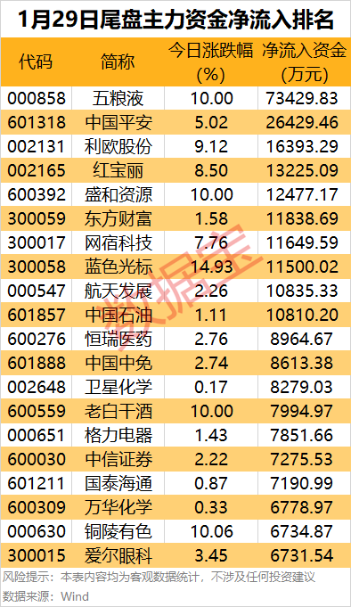 从个股来看,10股尾盘主力资金净流入金额均超1亿元,其中白酒龙头股五粮液尾盘主力资金净流入7.34亿元,居首。中国平安涨5.02%,尾盘主力资金净流入2.64亿元,居次席。