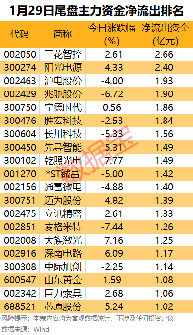 此外,还有沪电股份、兆驰股份、宁德时代、胜宏科技和长川科技等热门股尾盘主力资金净流出金额居前。