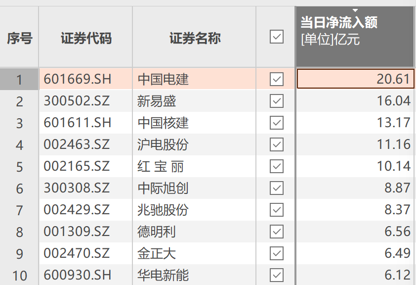 资金风向标 | 中国电建获资金净流入20.61亿元