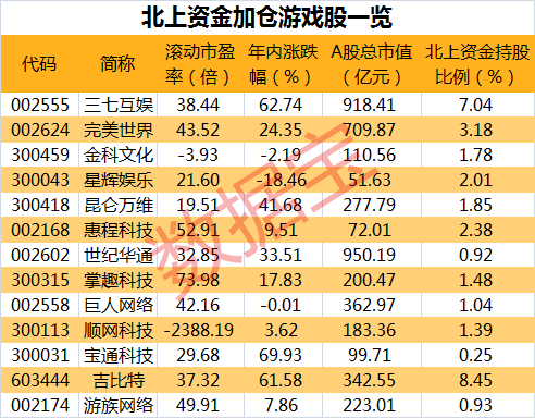 证券时报·数据宝统计显示,与今年年初相比,获北上资金加仓的游戏股有三七互娱、金科文化、完美世界、星辉娱乐、惠程科技和顺网科技等13股,三七互娱获北上资金加仓最多,从年初的占流通比例的3.49%加仓至最新的7.04%,公司股价年内累计上涨62.74%,近期股价屡创历史纪录。金科文化年初北上资金持股比例仅有0.33%,最新则有1.78%。获北上资金加仓的游戏股中,宝通科技年内涨幅最大,年内累计上涨69.93%,宝通科技自研的《终末阵线》由哔哩哔哩独家代理,将在7月份进行推广。获北上资金加仓的游戏公司中,星辉娱乐年内股价跌幅最大,下跌18.46%。
